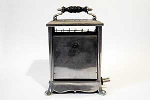 This old Simplex toaster is from England. It has cast iron base and top. Notice the beautiful shaped handle on top and the nice feet. A very heavy piece.