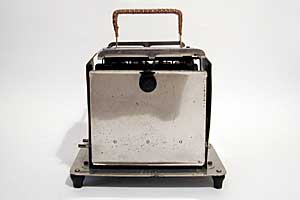 This is an old Rowenta toaster. It is similar to the Simplex T 211 or the big Omega (go to Permanent Exhibition), but has a more geometrical shape and a different base. Notice the extensible toaster holders on top.